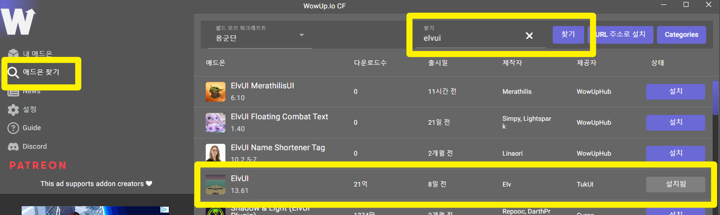 wowup 실행 - 애드온 찾기 - 검색어에 elvui 입력 후 찾기 버튼 클릭합니다.