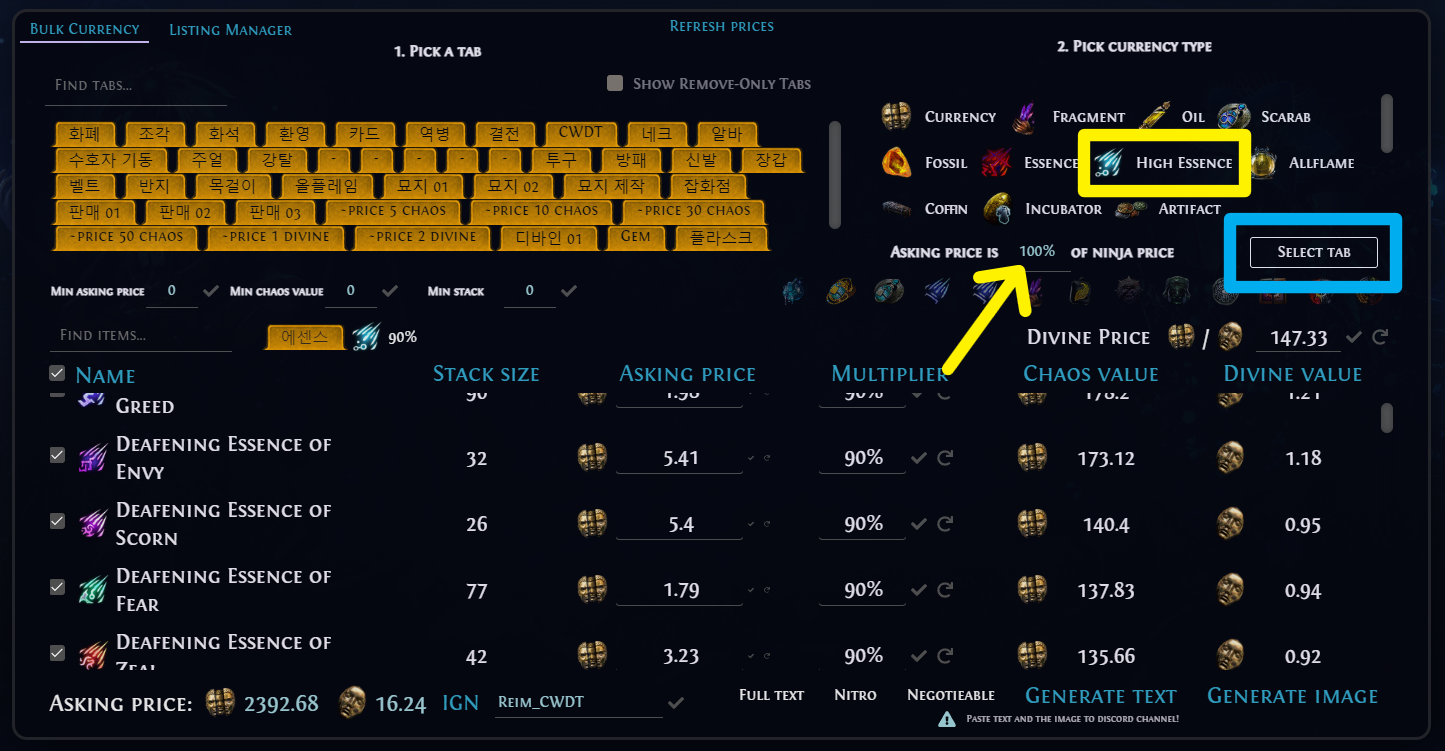 - 왼쪽 Pick a Tab 에서 에센스를 모아둔 판매용 보관함을 선택합니다.