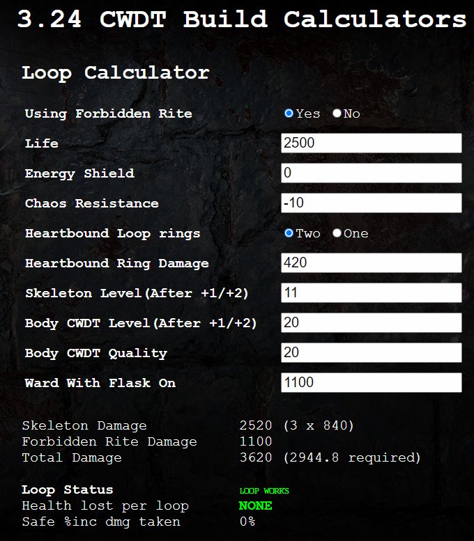 3.24 CWDT Build Calculators Health Lost per loop If any part of your self damage is greater than your Ward, then don't use Mind Over Matter or you'll run out of mana. You cannot run less recovery map mods. It does not break the build, but you have to be ca