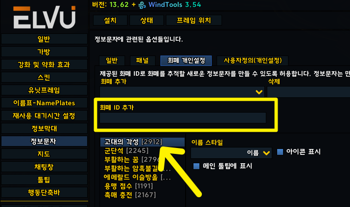 정보문자 - 화폐ID 추가 - 2912 입력하고 엔터
