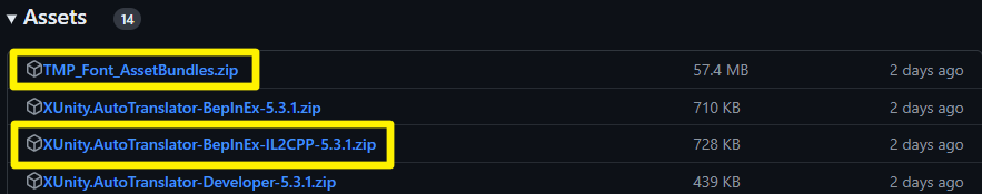 위 사이트에서 TMP_Font_AssetBundle과 XUnity.AutoTranslator-BepInEx-IL2CPP 파일을 다운받으세요.