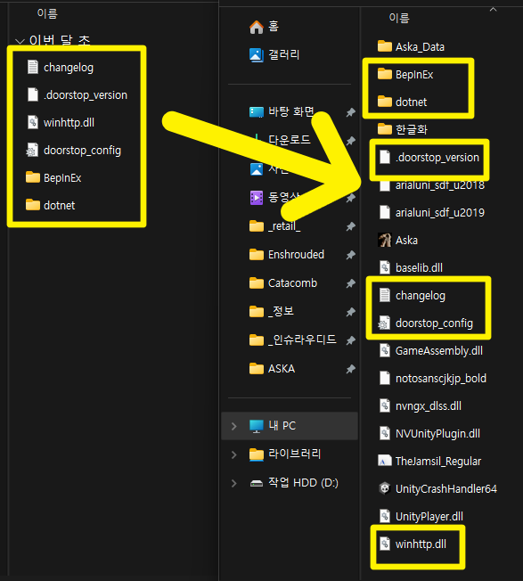 압축을 풀고 나온 모든 파일들을 게임 실행파일이 있는 경로에 붙여 넣기 합니다.