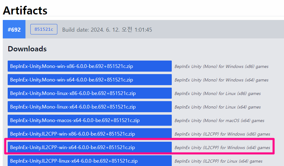 윈도우 사용자는 대부분 BepInEx-Unity.IL2CPP-win-x64 파일을 받으면 됩니다.