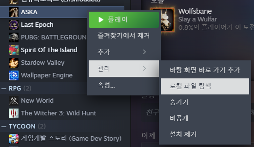 게임 실행 파일 위치는 스팀 라이브러리 > ASKA > 관리 > 로컬 파일 파일 탐색으로 열 수 있습니다.