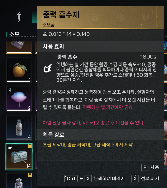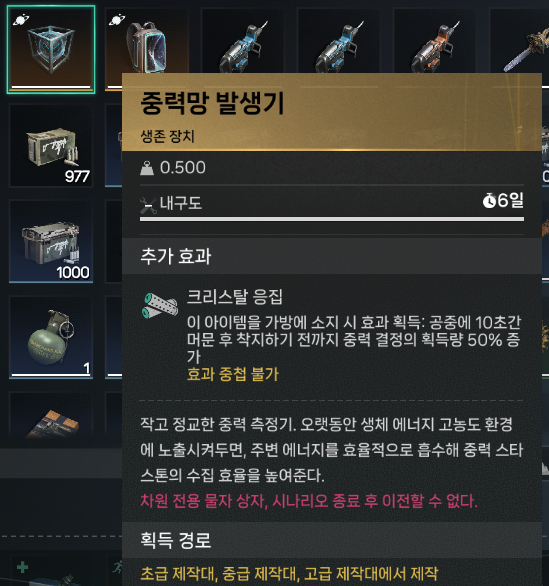 - 중력망 발생기 : 결정을 추가로 획득하기 위한 아이템으로 결정런 상자에서 제조법 획득 가능