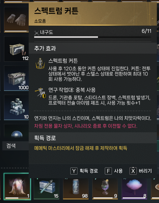 - 스펙트럼 커튼 : 고렙 엘리트 몹 등을 피해기 위한 은신 아이템으로 리퍼 마켓에서 구입하거나 메메틱으로 생산 가능