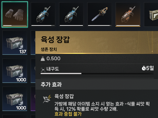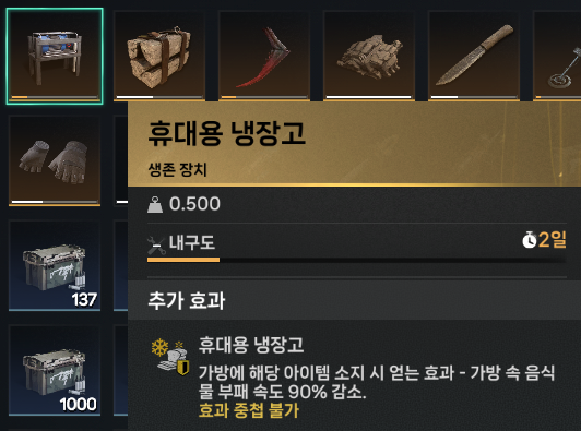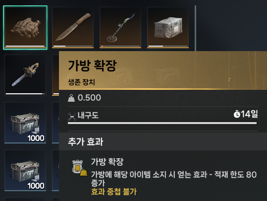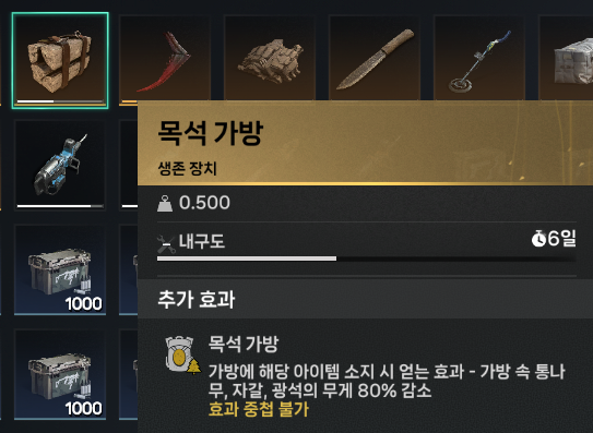 가방 확장과 목석 가방은 인벤토리에 넣어두면 무게에 대한 부담감을 많이 줄일 수 있게 됩니다.